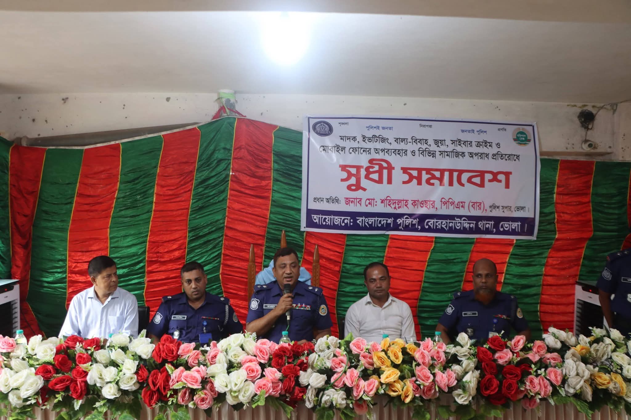 আজ বোরহানউদ্দিন থানা প্রাঙ্গণে মাদক, ইভটিজিং, বাল্যবিবাহ, জুয়া, সাইবার ক্রাইম ও মোবাইল ফোনের অপব্যবহার রোধে 'সুধী সমাবেশ’ অনুষ্ঠিত হয়েছে। নিরাপদ ও অপরাধমুক্ত সমাজ বিনির্মাণে পুলিশের এই মহতী উদ্যোগে শামিল হন স্থানীয় গণ্যমান্য ব্যক্তিবর্গ ও সাধারণ জনতা।